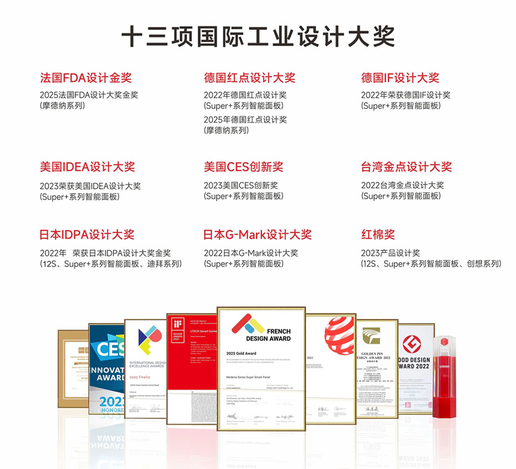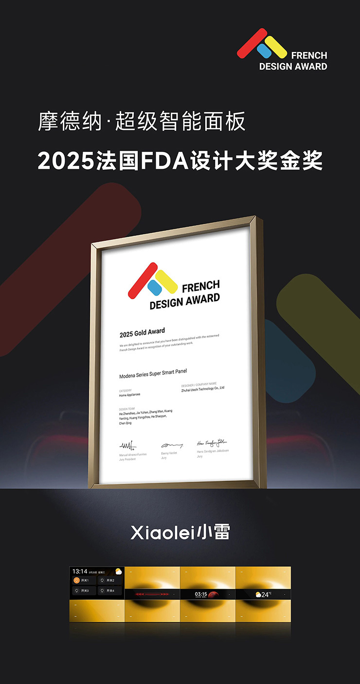 小雷智能家居重塑智能生活的美学定义!摩德纳超级智能面板系列凭借突破性的设计理念与卓越的产品实力,一举斩获法国设计大奖(FDA)金奖!法国设计奖由国际设计奖协会(IAA,International Awards Association)创立于法国,由全球顶尖设计专家组成的评审团严苛评选,作为一项享有盛誉的全球盛事,法国设计奖吸引了全球和各行业的领先品牌,其中包括财富500强企业及行业巨头。