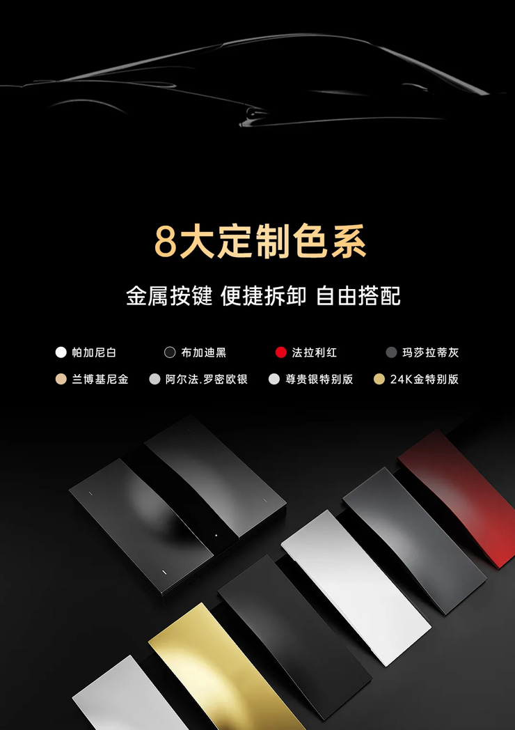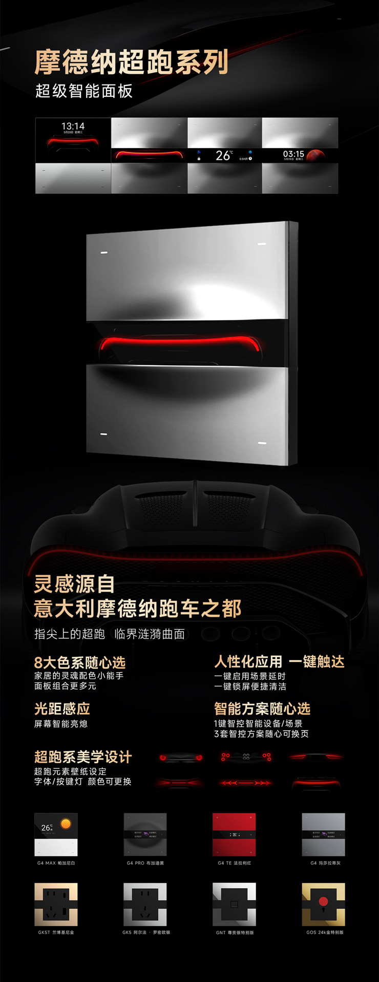 摩德纳·超级智能面板系列将速度与激情的美学融入智能家居,更涵盖有网关款、温控款、开关款、USB五孔插座、SOS面板等品类。并缔造有8大超跑色系——