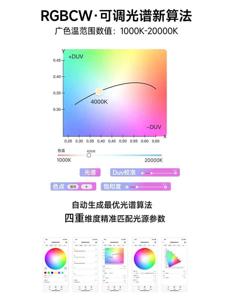 产品通过RGBCW广色域广色温可调光谱算法