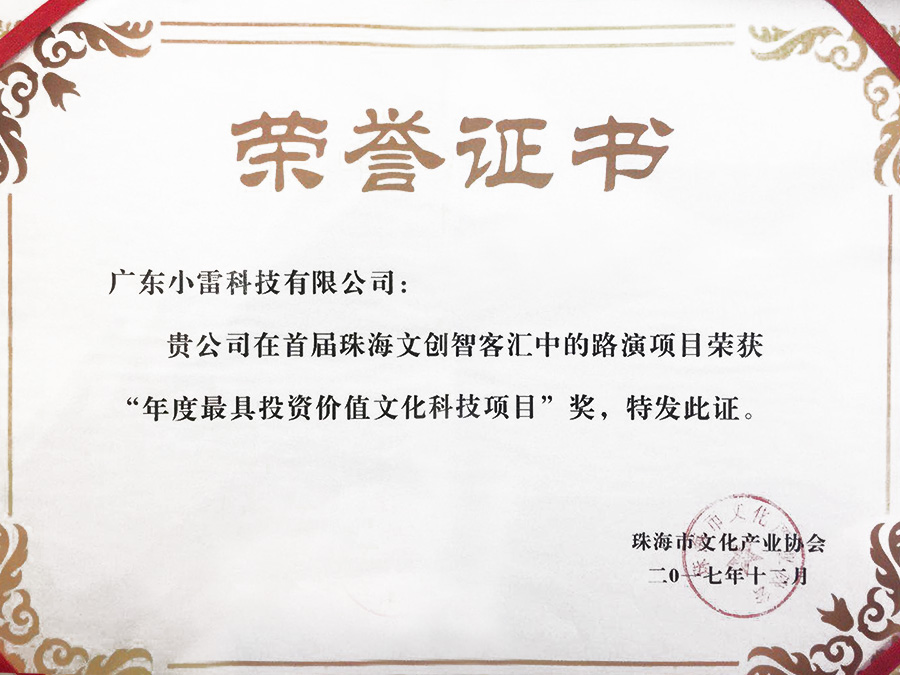 正所谓,一分耕耘,一分收获。1月2日下午,在文化科技博览会举办首届珠海文创智客汇颁奖典礼上,小雷科技在智客汇五期路演环节中经过大众评选与专家评选中脱颖而出,荣获“年度最具投资价值文化科技项目”。此次获奖也很好地为小雷团队在2017年的辛勤付出画上一个完美的句号。